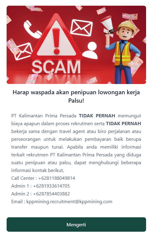 ⚠️ Seluruh proses rekrutmen KPP Mining gratis. Waspada terhadap penipuan yang mengatasnamakan perusahaan.