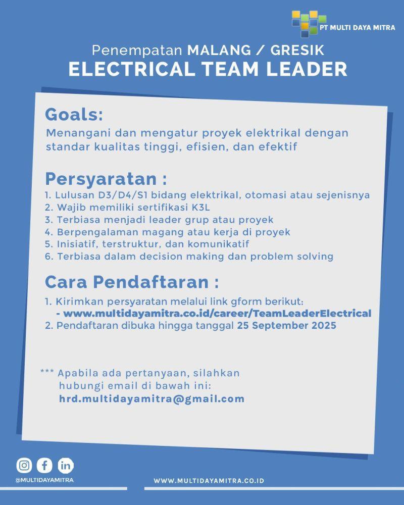Lowongan Kerja PT Multi Daya Mitra – Electrical Team Leader