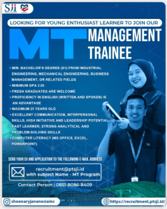 Saat ini, PT Shoenary Javanesia INC membuka kesempatan bagi talenta muda untuk bergabung dalam Program Management Trainee (MT). Program ini dirancang untuk mencetak calon pemimpin masa depan perusahaan melalui pembekalan keterampilan manajerial, teknis, dan kepemimpinan yang komprehensif.