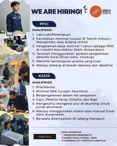 - Pendidikan minimal SMA/SMK (untuk Kasir), D3/S1 (untuk PPIC)