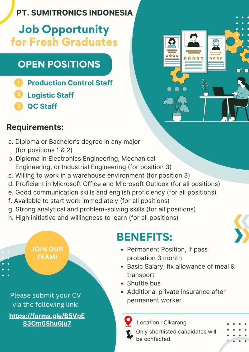 PT Sumitronics Indonesia, perusahaan manufaktur elektronik ternama asal Jepang, kembali membuka kesempatan karier bagi talenta muda profesional. Jika kamu memiliki semangat kerja tinggi dan ingin berkembang di industri elektronik global, inilah saat yang tepat untuk bergabung bersama Sumitronics Indonesia.