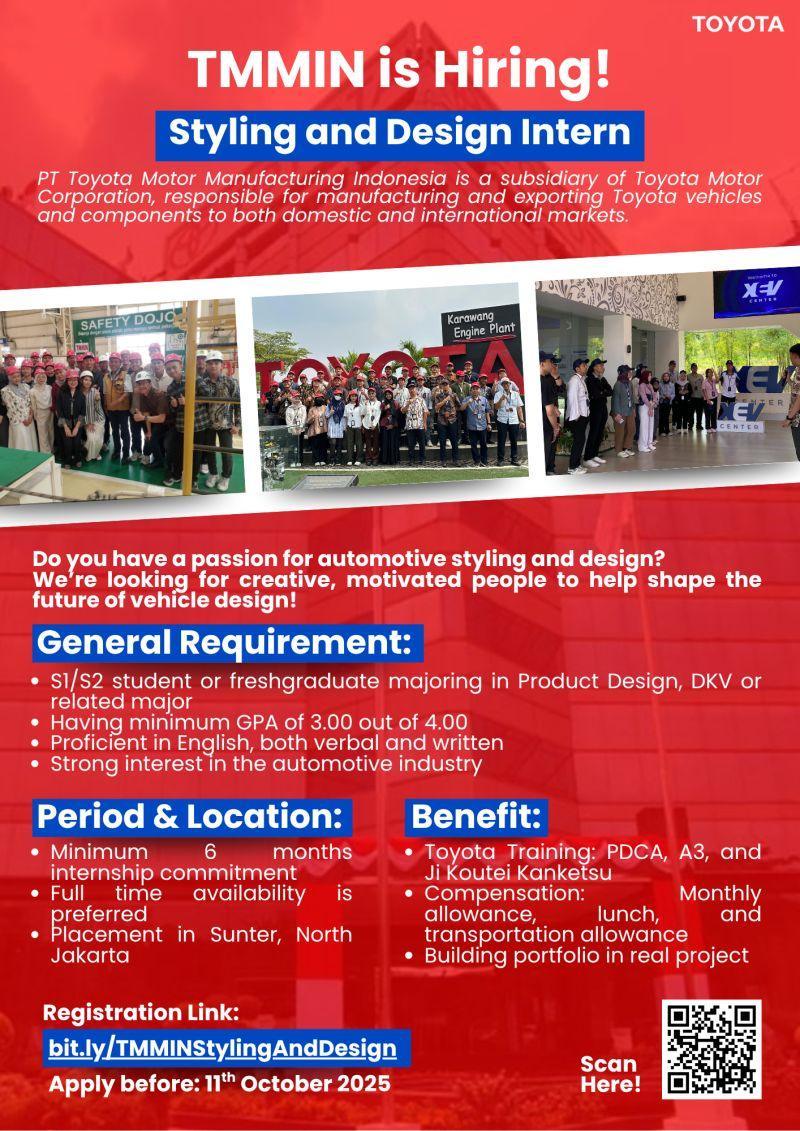 Inilah kesempatan Anda untuk menjadi bagian dari Toyota Internship Program for Styling and Design – sebuah program magang yang dirancang untuk mengembangkan potensi dan kreativitas dalam dunia desain kendaraan masa depan.